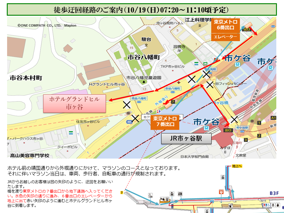 ホテルグランドヒル市ヶ谷が面している靖国通り・外堀通りも、マラソンコースに含まれていますので、 当日は、交通規制の影響を受けることになります。