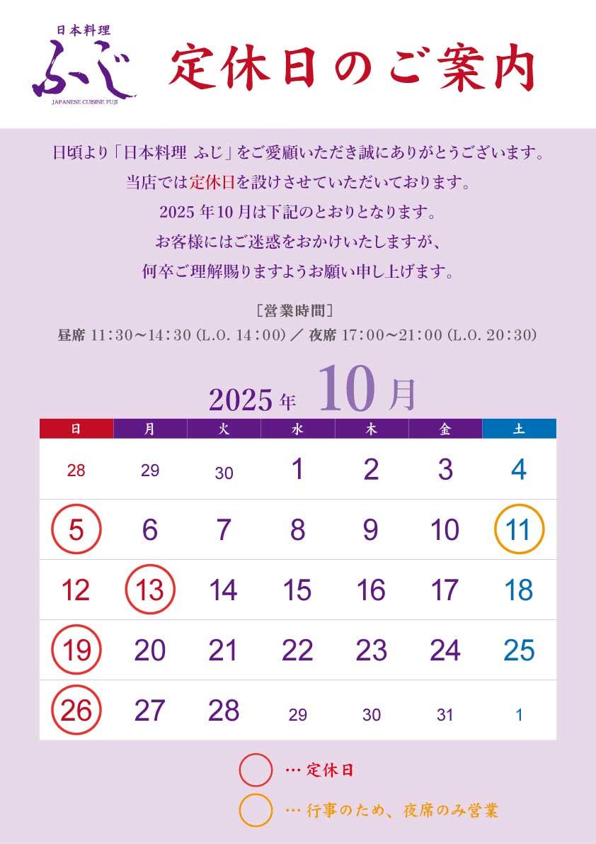 日頃より、「日本料理ふじ」をご愛顧いただき、誠にありがとうございます。 当店では定休日を設けさせていただいております。10月は下記のとおりとなります。 皆様にはご迷惑をおかけいたしますが、何卒ご理解の程宜しくお願い申し上げます。