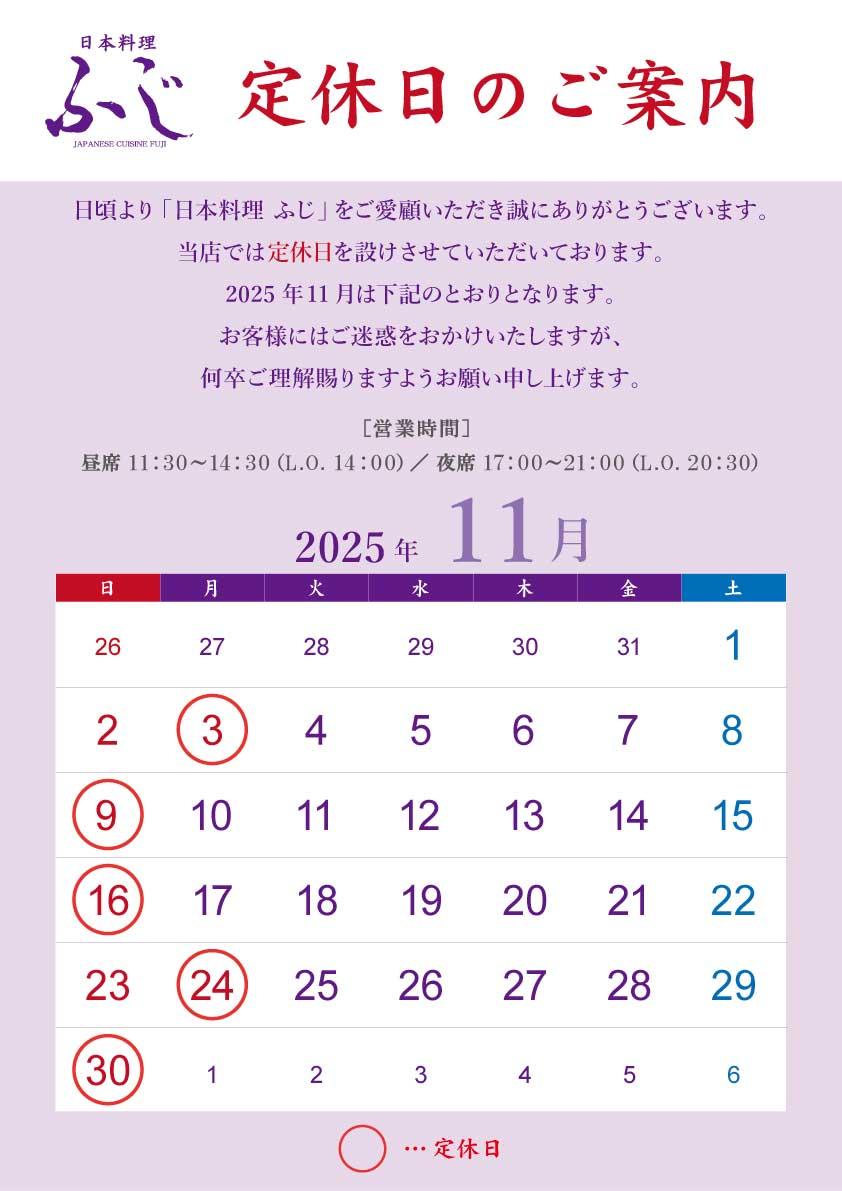 日頃より、「日本料理ふじ」をご愛顧いただき、誠にありがとうございます。 当店では定休日を設けさせていただいております。11月は下記のとおりとなります。 皆様にはご迷惑をおかけいたしますが、何卒ご理解の程宜しくお願い申し上げます。