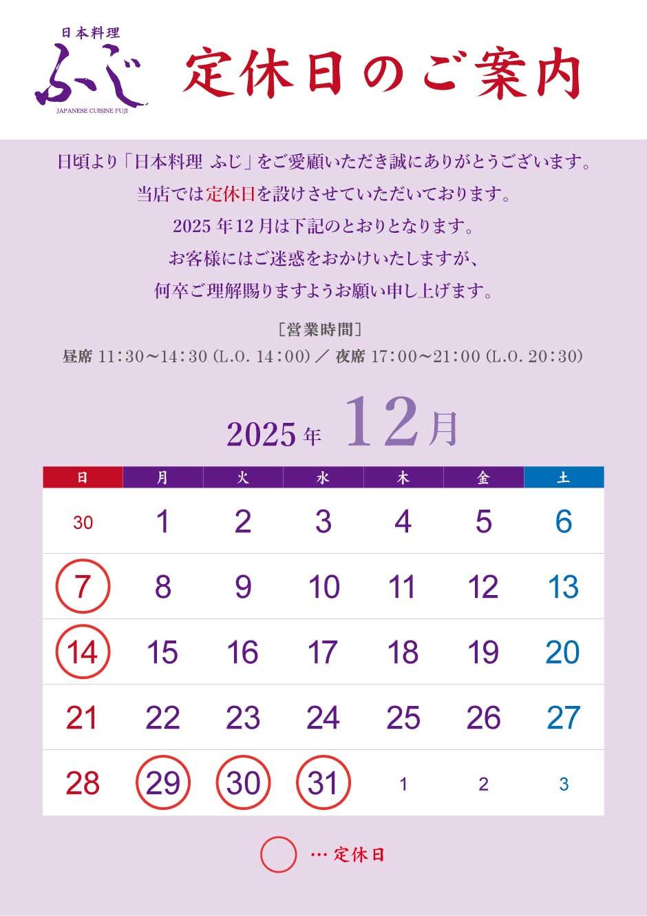 日頃より、「日本料理ふじ」をご愛顧いただき、誠にありがとうございます。 当店では定休日を設けさせていただいております。12月は下記のとおりとなります。 皆様にはご迷惑をおかけいたしますが、何卒ご理解の程宜しくお願い申し上げます。