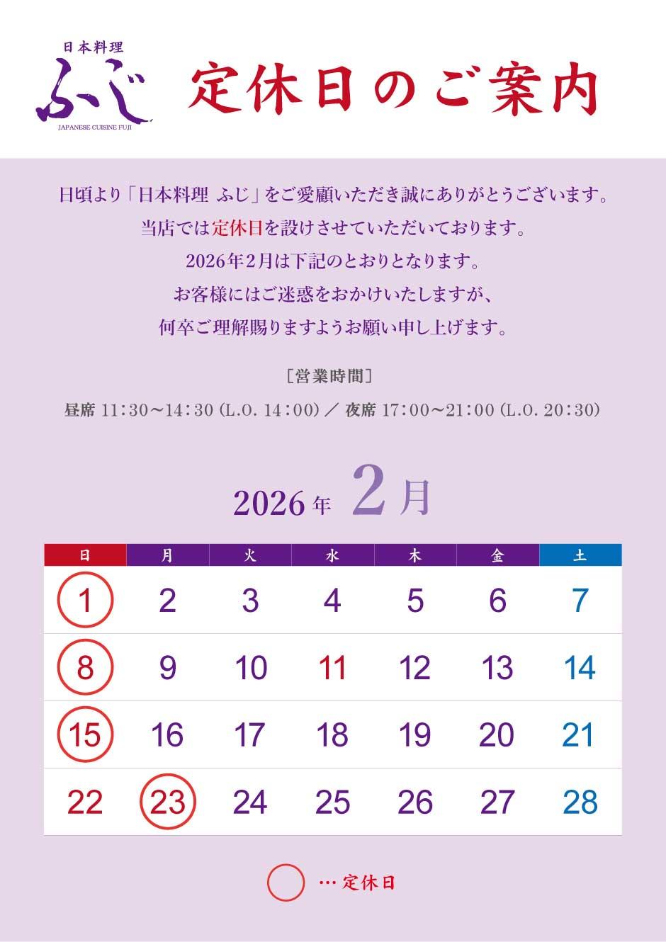 日頃より、「日本料理ふじ」をご愛顧いただき、誠にありがとうございます。 当店では定休日を設けさせていただいております。2月は下記のとおりとなります。 皆様にはご迷惑をおかけいたしますが、何卒ご理解の程宜しくお願い申し上げます。