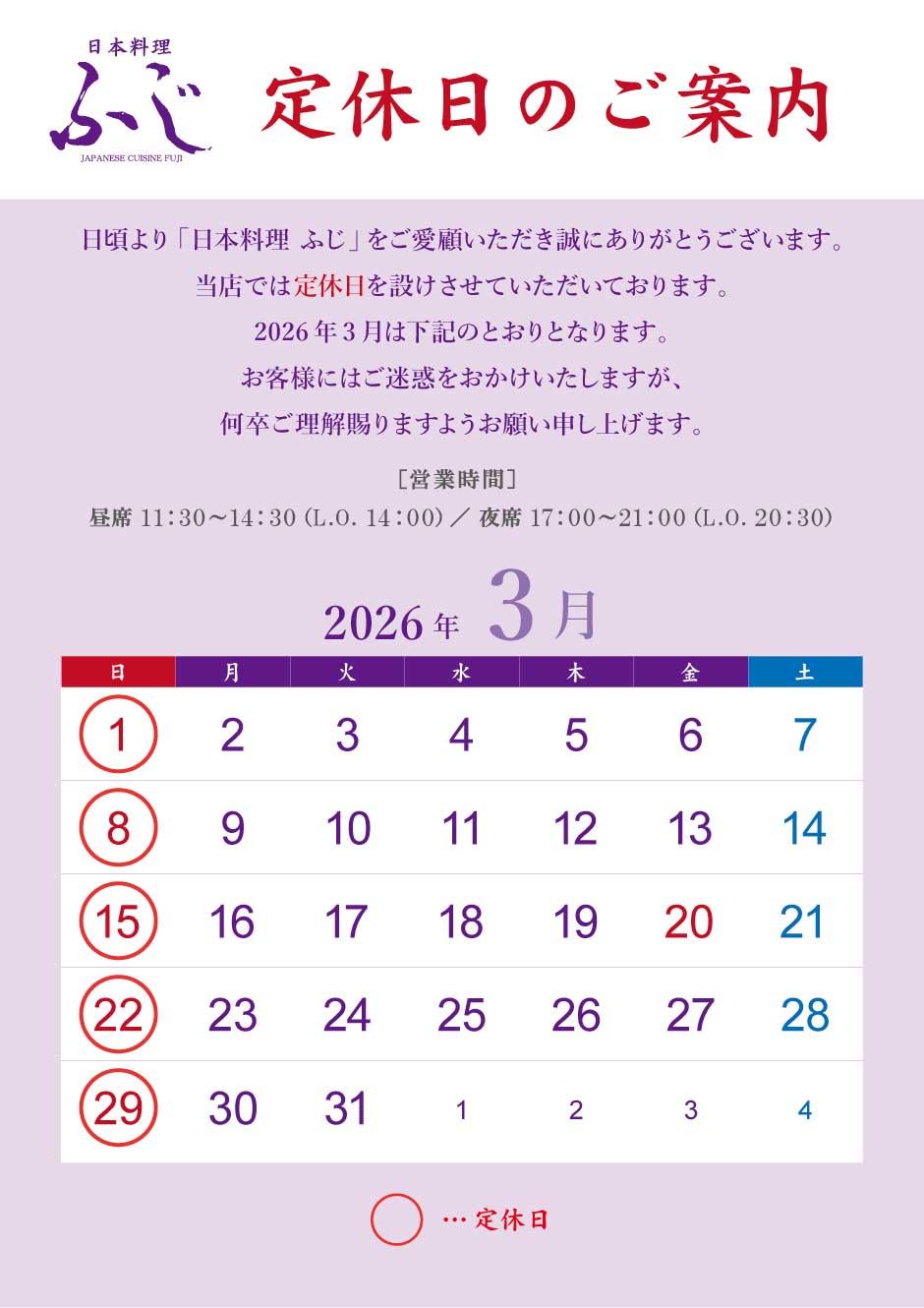 日頃より、「日本料理ふじ」をご愛顧いただき、誠にありがとうございます。 当店では定休日を設けさせていただいております。3月は下記のとおりとなります。 皆様にはご迷惑をおかけいたしますが、何卒ご理解の程宜しくお願い申し上げます。