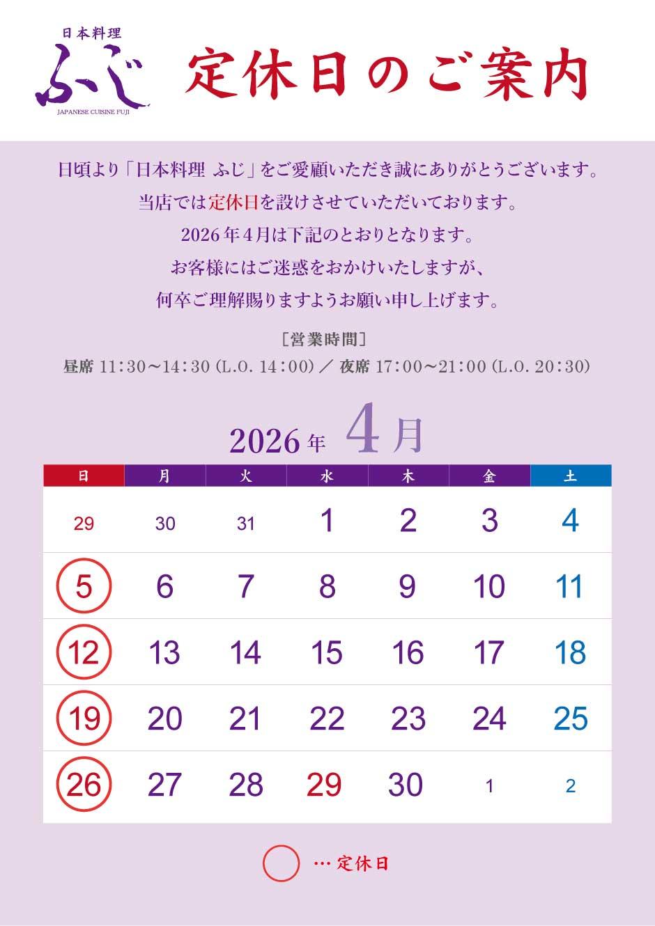 日頃より、「日本料理ふじ」をご愛顧いただき、誠にありがとうございます。 当店では定休日を設けさせていただいております。4月は下記のとおりとなります。 皆様にはご迷惑をおかけいたしますが、何卒ご理解の程宜しくお願い申し上げます。