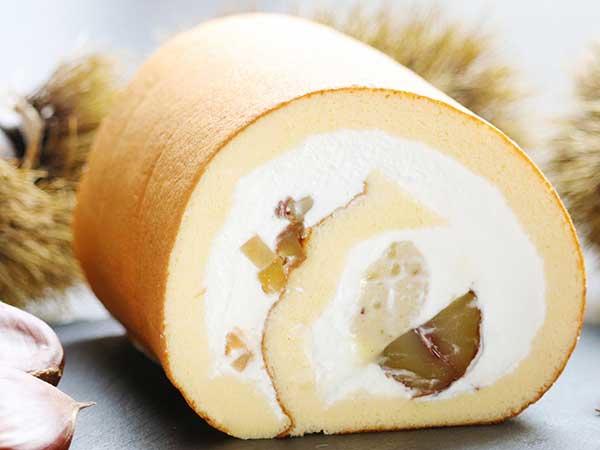 国産和栗のペーストにカスタードを合わせたクリームと、熊本県産和栗の渋皮煮をフレッシュな生クリームとしっとりもちもちの米粉のロール生地で巻き上げました。
